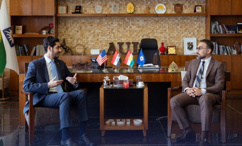 استقبل رئيس الجامعة الأمريكية في السليمانية د.بلال وهاب، المنسق العام للمجموعة العراقية للشؤون الخارجية الأستاذ يوسف المحسن، حيث جرى بحث سبل تعزيز التعاون الأكاديمي والبحثي، وتطوير الشراكات في مجالات الدراسات الاستراتيجية، وصناعة السياسات العامة، ودبلوماسية المسار الثاني.